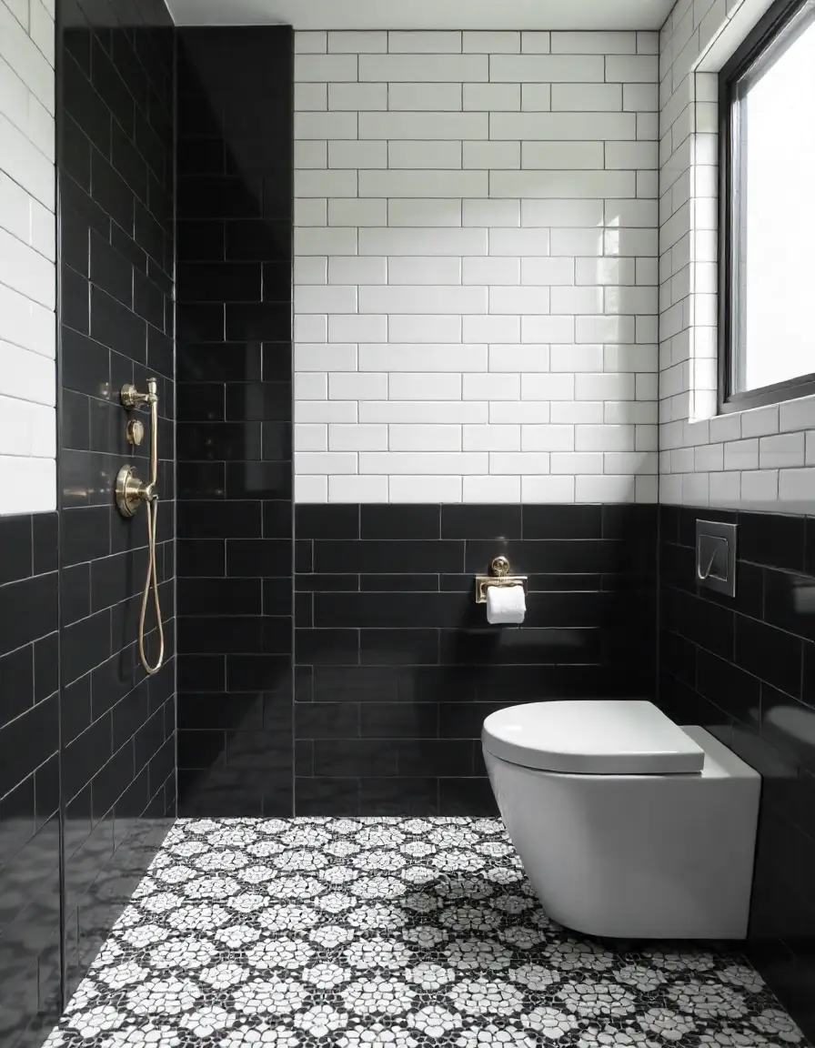 Darker tiles on floors or feature strips add contrast while keeping the space refined.